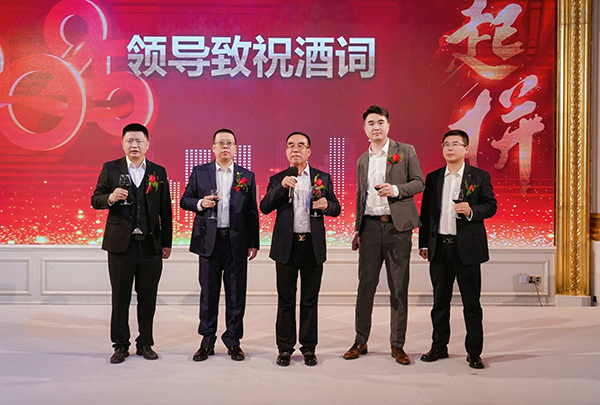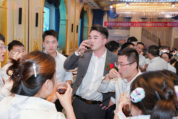 致辞结束后,韩晓总裁、杨帅副总裁、韩超副总裁、白云冰总经理、唐世豪总经理助理联袂上台,向全体员工和嘉宾敬酒。宾主共同举杯,祝合肥第二分公司一周岁生日快乐,祝合肥第二分公司业绩长虹,财源广进。
