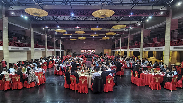 晚上7时许,夜幕降临,华灯初上,陕西大秦温泉假日酒店流光溢彩,金碧辉煌。韩总裁在酒店大宴会厅筵开20席,为陕西万乘的全体将士庆功。刚刚走下工作岗位的万乘小伙伴洗去征尘,喜气洋洋,欢声笑语,共享万乘的荣耀时刻。