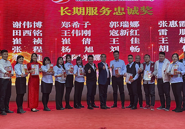 在欢快的音乐声中,张斌副总经理为获得“优秀员工奖”的10名员工颁发获奖证书及奖金;集团副总裁崔明绪为获得“优秀团队长奖”的4名管理人员颁发获奖证书和奖金;韩晓总裁、集团董事会秘书刘润东为19名获得“五年以上长期服务忠诚奖”的员工颁发获奖证书和奖金。