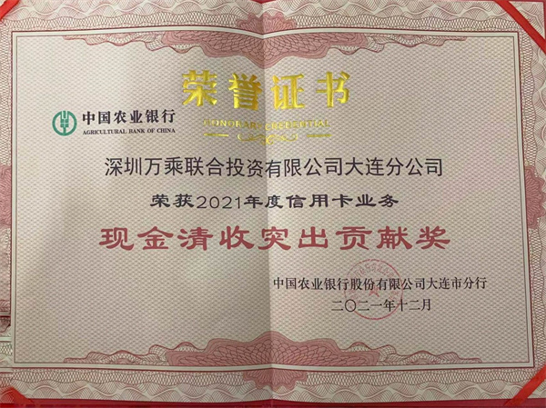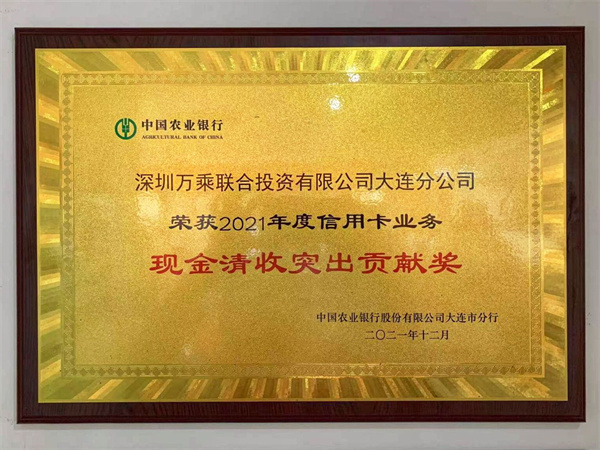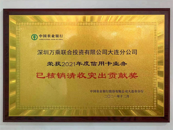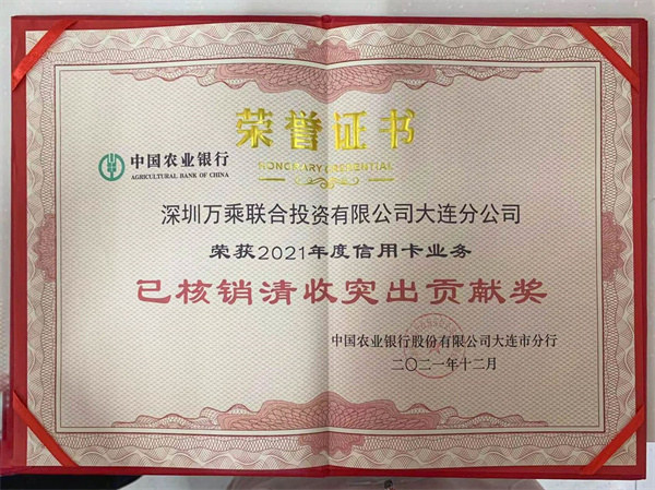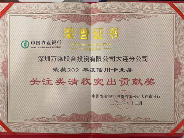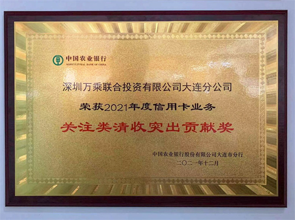 2021年12月21日,在农业银行大连分行信用卡中心召开的2021年度表彰大会上,大连万乘一举囊括:关注类清收突出贡献奖、已核销清收突出贡献奖、现金清收突出贡献奖,全部三项大奖。金杯银杯不如甲方的口碑,这是大连万乘也是万乘集团的巨大荣誉,更是农行上下各级领导、各位老师对万乘的认可、鼓励和厚爱。