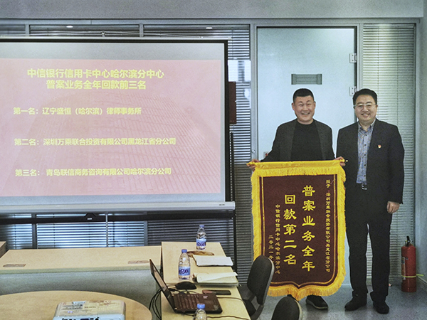会议由中信银行信用卡中心哈尔滨分中心风险管理室陶伟经理主持,会议上各机构汇报了2021年工作总结并对2022年工作进行了规划。中信银行信用卡中心哈尔滨分中心吴江总经理为黑龙江万乘颁发普案业务全年回款第二名的锦旗。