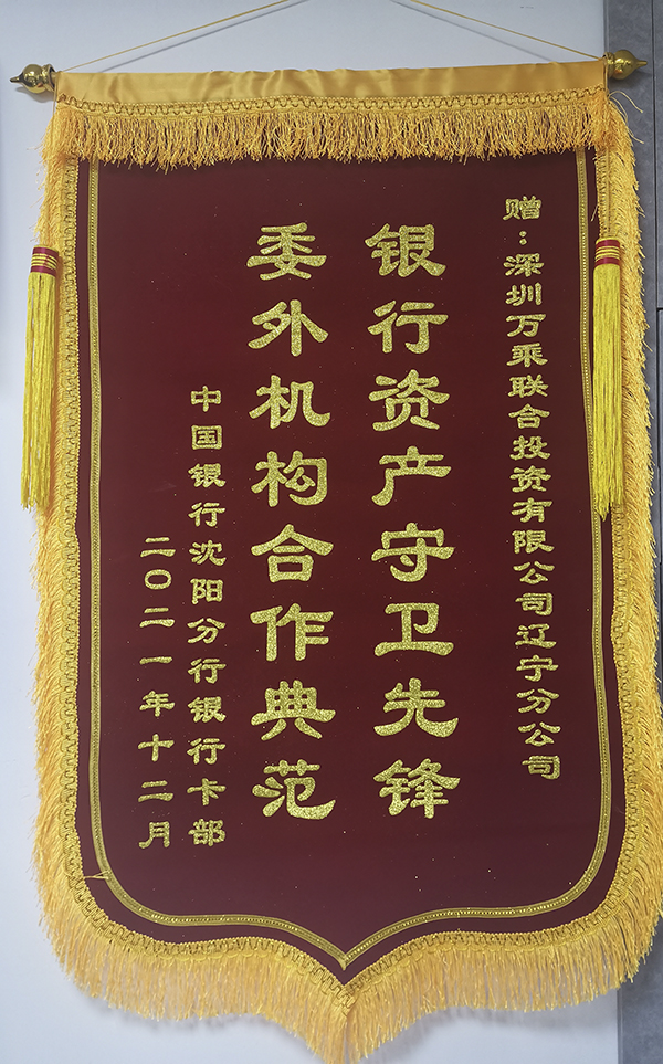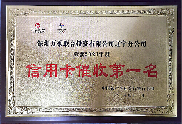 谢总表示,明天(2022年1月1日)就是新的一天、新的一年、新的合作起点,特授予辽宁万乘“2021年度信用卡催收第一名”奖牌、“银行资产守卫先锋、委外机构合作典范”锦旗。