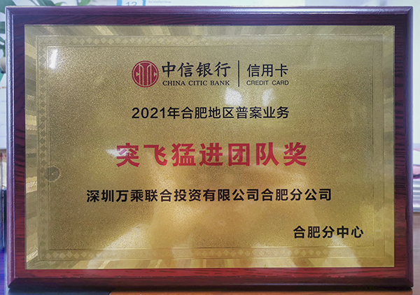 2022年1月7日,在中信银行合肥分中心举办的2021年度总结大会上,合肥万乘荣获中信银行合肥分中心2021年度“突飞猛进团队奖”。合肥万乘总经理孙宇及中信银行业务团队管理人员一同参加会议,并领取了这块沉甸甸的荣誉奖牌。