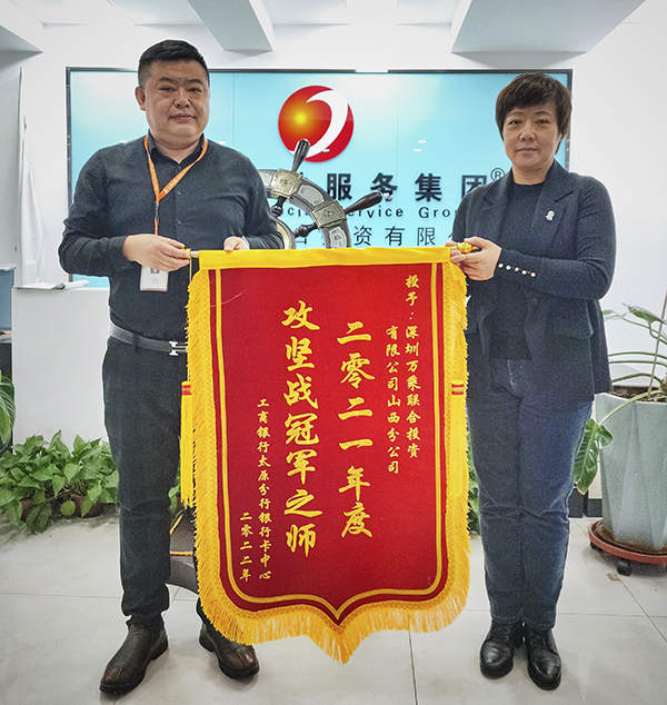 2022年1月11日,工商银行太原分行信用卡中心梁总、李行长、尹经理一行莅临山西万乘检查指导工作,并为山西万乘荣获工商银行太原分行银行卡中心2021年度“攻坚战冠军之师”颁发锦旗,山西万乘总经理王龙热情招待了来访领导。