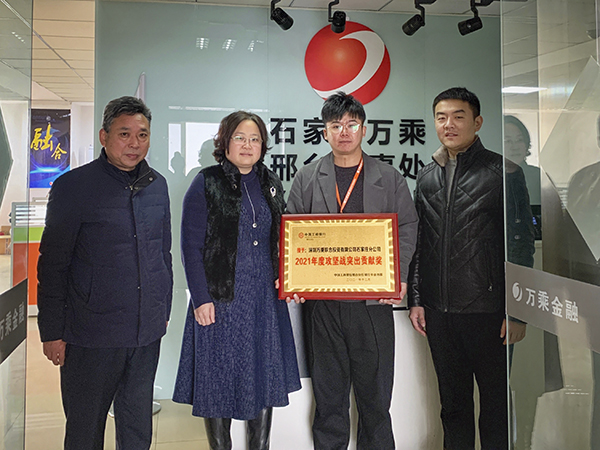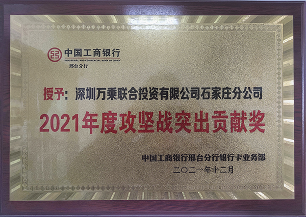 2022年1月11日,石家庄万乘邢台办事处伴随着晨曦的朝阳,迎来了中国工商银行邢台分行信用卡业务部宋士爽处长、张尧副处长、赵立中经理莅临我司视察指导工作,并为石家庄万乘荣获中国工商银行邢台分行2021年度“攻坚战突出贡献奖”颁发荣誉奖牌。