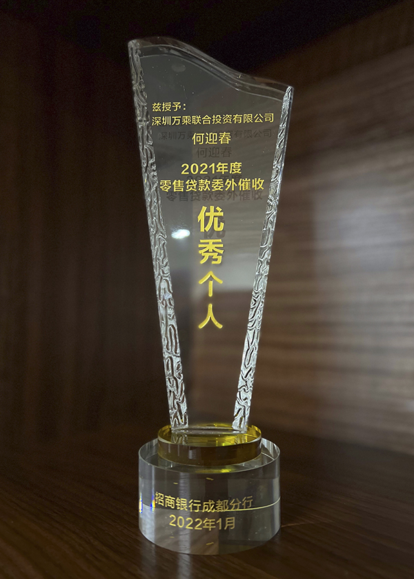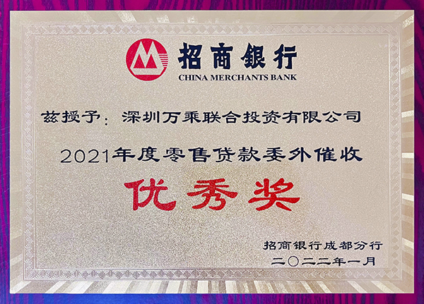 2022年1月21日,招商银行成都分行零售部相关领导在成都万乘举行颁奖仪式,为成都万乘荣获招商银行成都分行2021年度零售贷款委外催收“优秀奖”和2021年度零售贷款委外催收“优秀个人”两项大奖颁发荣誉奖牌。
