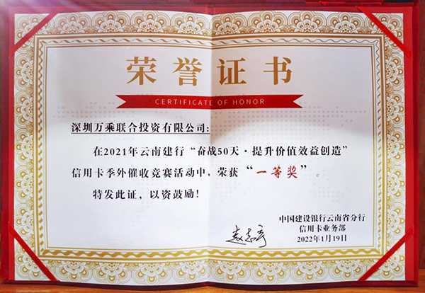 2022年1月19日,中国建设银行云南省分行信用卡中心召开表彰大会,万乘云南大区在2021年云南建行“奋战50天·提升价值效益创造”信用卡季外催收竞赛活动中荣获“一等奖”。