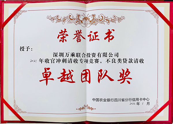 锲而不舍,金石可镂,一件事的成功,离不开长期的奋斗与坚持。2022年2月18日,在中国农业银行四川省分行召开的专项会议上,成都万乘以优异的成绩荣获中国农业银行四川省分行信用卡中心2021年收官冲刺清收专项竞赛不良类贷款清收“卓越团队奖”,公司两名业务骨干也同时获得“不良类贷款清收卓越之星”奖项。