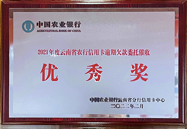 2022年2月22日,中国农业银行云南省分行信用卡中心在外包公司召开表彰大会,万乘集团云南大区荣获中国农业银行云南省分行2021年度信用卡逾期欠款委托催收“优秀奖”。
