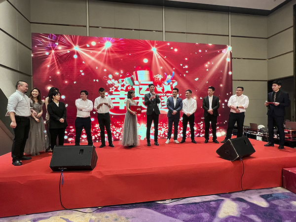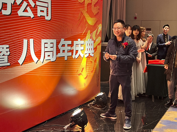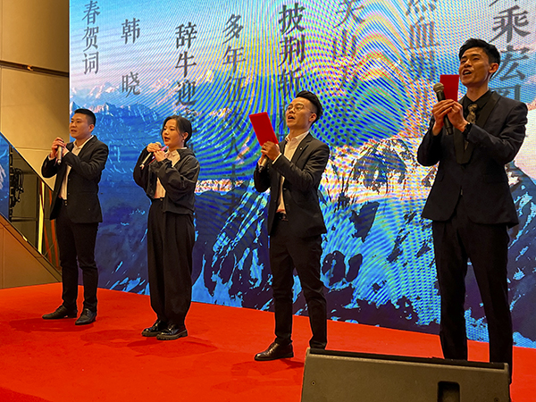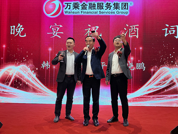 在5名员工朗诵了韩总裁撰写的“虎年抒怀”的诗歌后,韩晓总裁、周卫平副总裁、刘晓鹏副总经理联袂登台,向全体员工和各位嘉宾敬酒。宾主共同举杯,祝温州万乘财源滚滚,业绩长虹!