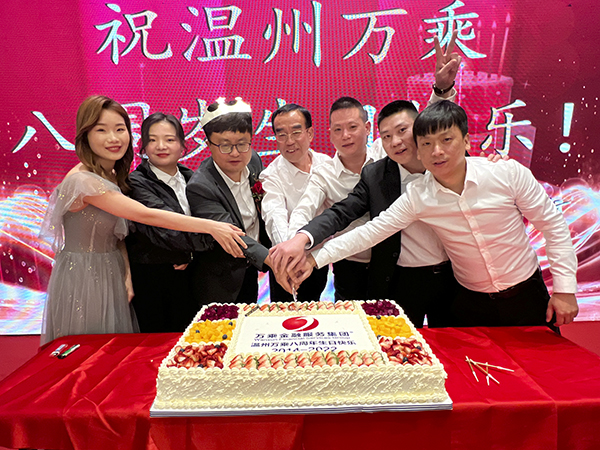 晚上8时许,在欢快的生日歌声中,摇拽着烛光的蛋糕车被缓缓地推到了舞台中央,韩总、刘总与5名优秀员工一块许愿、吹腊烛、切蛋糕,共祝温州万乘8岁生日快乐!