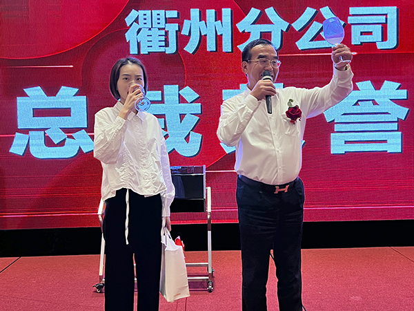 韩晓总裁发表了热情洋溢的讲话。韩总裁指出,去年11月13日,我来这里为衢州公司的开业剪彩,3个月后我再次来到这里,为衢州公司1月份佣金收入突破100万元举办“总裁荣誉宴”,这是一件多么神奇的事情,它充分证明,只要拚搏,只要努力,所有的梦想都会开花,所有的奇迹都会发生。韩总裁亲切勉励大家,发扬不怕疲劳连续作战的精神,乘胜追击,增员增效,在今年再创新业绩,再铸新辉煌!