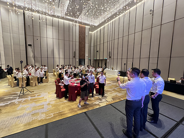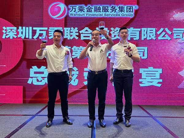 表彰活动结束后,韩晓总裁、集团董事会秘书刘润东与颜总联袂登台,向全体员工和各位嘉宾敬酒。宾主共同举杯,祝东莞第二分公司业绩长虹,财源滚滚。