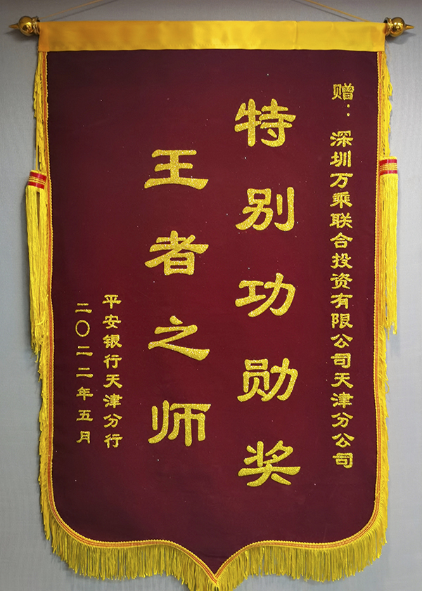 2022年5月10日,在平安银行天津分行召开的年度总结大会上,天津万乘荣获平安银行天津分行2022年“特别功勋奖王者之师”荣誉称号。
