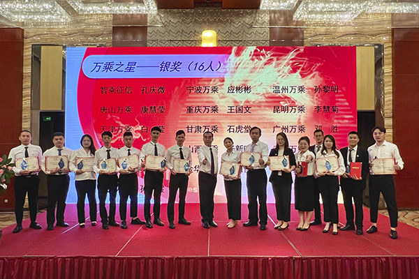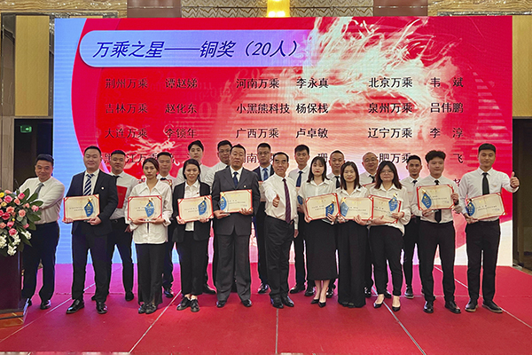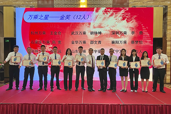 会议的第二项是颁发2021年度万乘之星奖项。随着歌声的结束,2021年度万乘之星颁奖典礼正式拉开帷幕。由韩晓总裁、崔明绪副总裁担任颁奖嘉宾,荣获万乘希望之星、万乘之星铜奖、银奖和金奖的获奖者依次上台,接受韩总、崔总为其颁发奖杯及证书,并合影留念。
