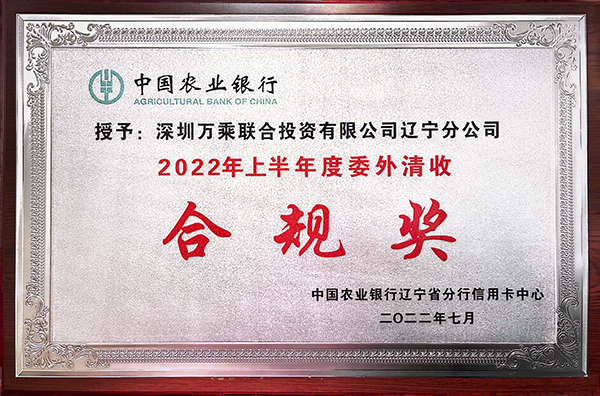 2022年我们一起走过了春的旖旎,迎来了夏的蓬勃。7月26日,中国农业银行辽宁省分行信用卡中心根据综合考评结果和上半年表现,授予辽宁万乘2022年上半年度委外清收“优胜奖”及“合规奖”奖牌。