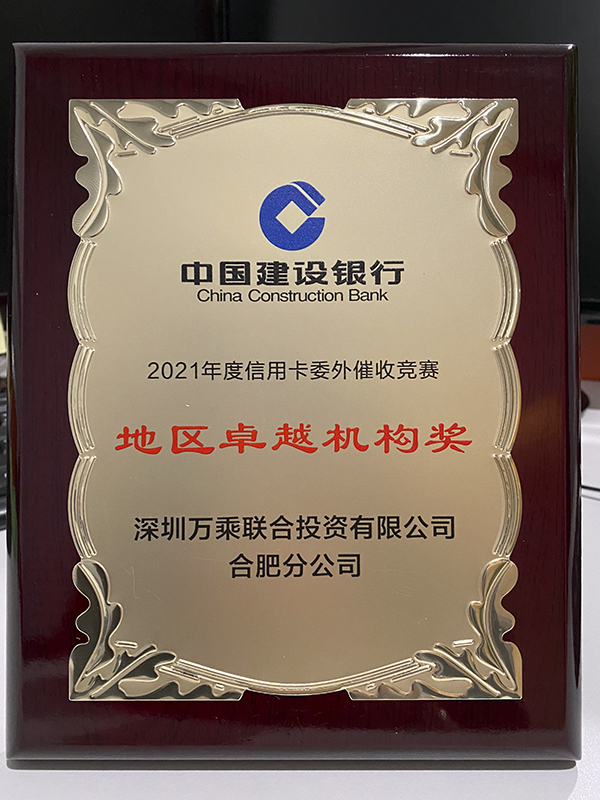 2022年7月,烈日炎炎,骄阳似火的盛夏,中国建设银行总行信用卡中心授予合肥万乘2021年度信用卡委外催收竞赛“地区卓越机构奖”。