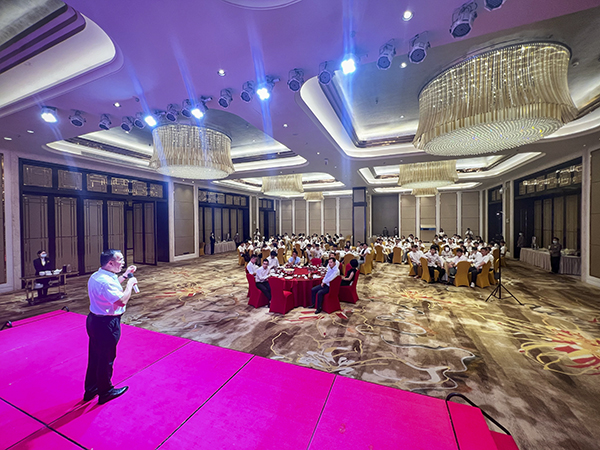 晚上6时许,夕阳西下,华灯初上,五星酒店东莞康帝国际大酒店宴会厅流光溢彩,金碧辉煌。120多名东莞第二分公司的小伙伴换下战袍,冼去征尘,欢声笑语荟聚一堂,共享万乘荣耀时刻。