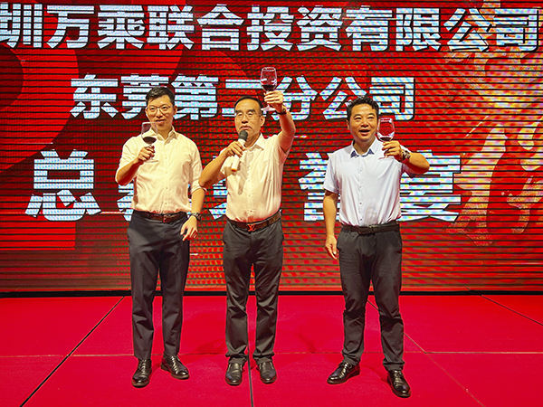 表彰活动结束后,韩晓总裁、集团董事会秘书刘润东、东莞第二分公司总经理助理颜腾飞联袂上台敬酒。宾主共同举杯,祝东莞第二分公司业绩长虹,财源滚滚。