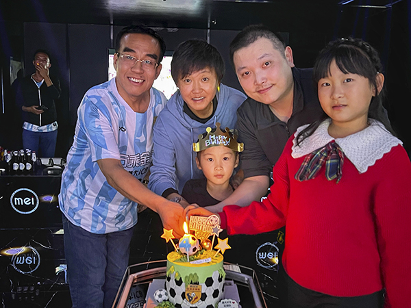 晚上10时许,全体人员移师魅KTV共度欢乐之夜。在韩晓总裁以一首“别知己”开场后,各位大神或歌或舞,各显神通,把现场气氛不断推向高潮。11时零8分,在摇拽的烛光中,蛋糕车被缓缓推进房间,全体人员起立合唱《生日歌》,韩晓总裁、滕巍女士、球员旷达夫及两位可爱的小朋友一起切开蛋糕。