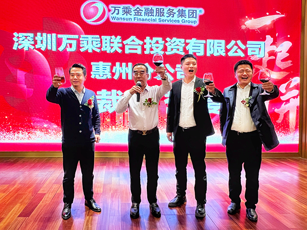 表彰活动结束后,韩晓总裁、刘润东董秘、杨帅副总裁、向东副总经理联袂登台,向各位嘉宾和全体员工敬酒。宾主共同举杯,祝惠州万乘在新的一年兔飞猛进,财源滚滚,业绩长虹!