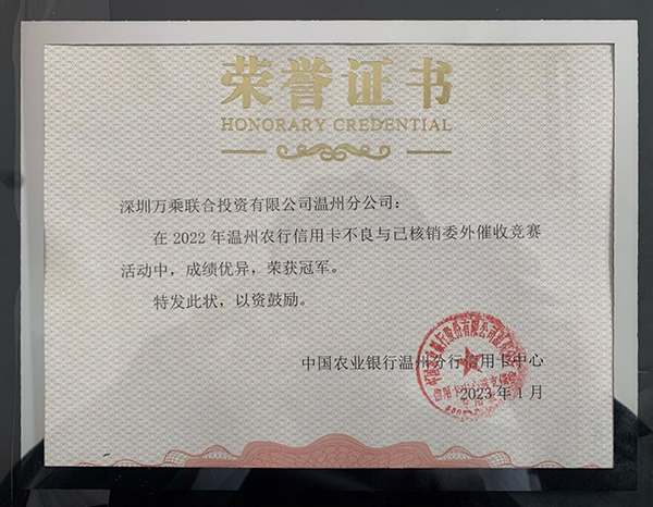 2023年1月12日下午,中国农业银行温州分行信用卡中心组织召开了2022年委外催收工作总结会议。在会议过程中,项总对温州万乘农行团队在2022年取得的成绩给予了高度的评价,并对今后的工作提出了指导和要求,希望温州再接再厉,2023年继续再创佳绩!并亲自为温州万乘荣获中国农业银行温州分行信用卡不良与已核销委外催收竞赛活动“冠军”颁发荣誉证书,温州万乘副总经理刘晓鹏代表温州万乘领取了荣誉奖状。