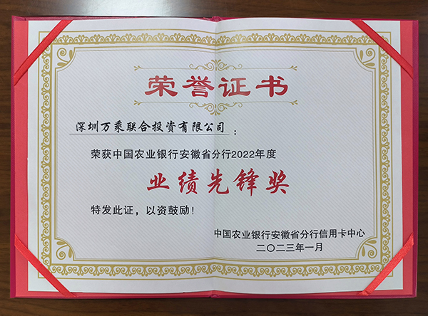 1月17日上午,在中国农业银行安徽省分行信用卡中心举行的2022年度总结大会上,农行安徽省分行领导高度认可了合肥万乘在2022年度对于农行安徽省分行信用卡逾期压降中做出的突出贡献,授予合肥万乘2022年度“业绩先锋奖”并颁发荣誉证书。