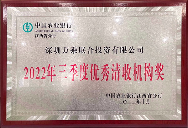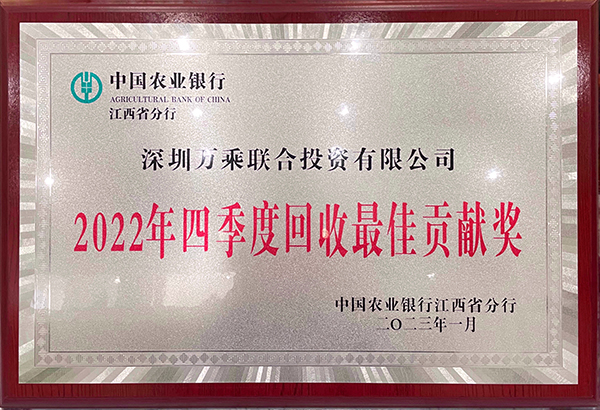 2023年2月15日,在中国农业银行江西省分行召开的2022年度总结会议上,江西万乘荣获中国农业银行江西省分行“2022年三季度优秀清收机构奖”、“2022年四季度回收最佳贡献奖”。
