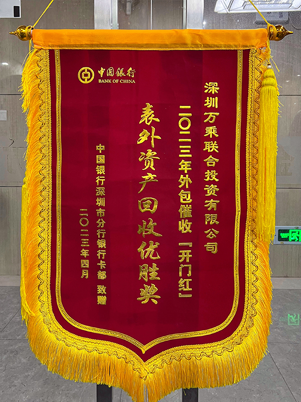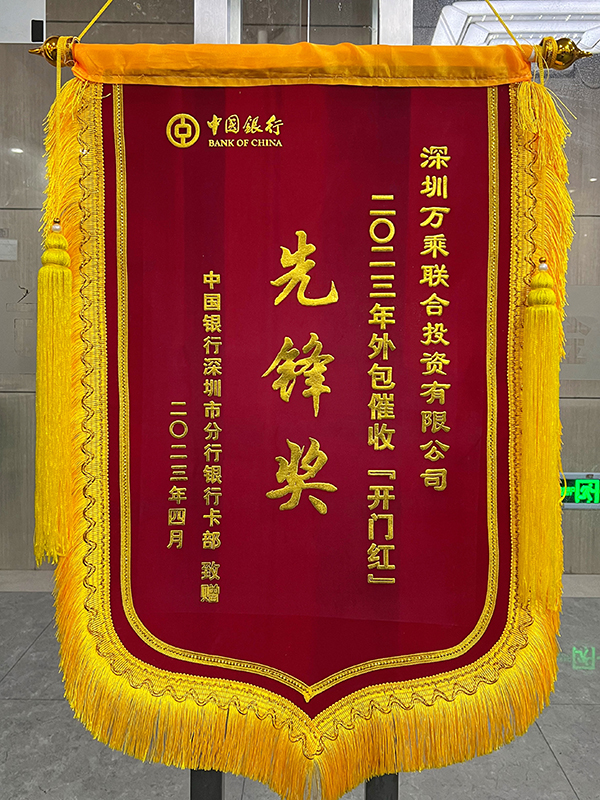 最美人间四月天,春暖清和,群芳次第。2023年4月27日下午,在中国银行深圳市分行2023年一季度外包催收“开门红”总结暨表彰大会上,中国银行深圳市分行卡中心董总为万乘深圳第一分公司荣获2023年外包催收开门红“表外资产回收优胜奖”和“先锋奖”颁发锦旗,以肯定我司中行团队在2023年第一季度所取得的优异成绩,万乘集团副总裁兼万乘深圳第一分公司总经理杨帅参加了此次会议。