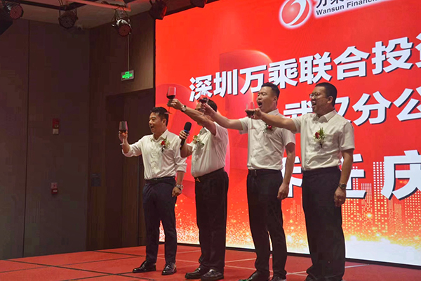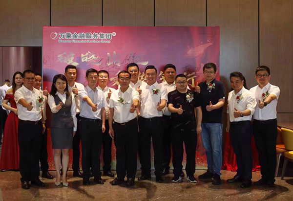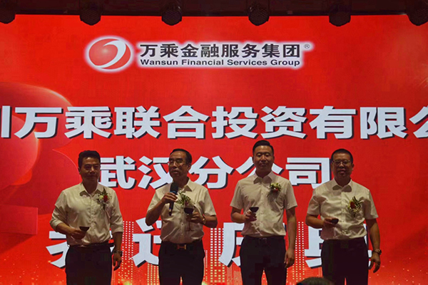 揭牌仪式后,韩总裁在武汉希尔顿欢朋大酒店筵开7席,宴请全体员工和各位嘉宾。在拍完“全家福”后,韩晓总裁、董事会秘书刘润东、副总裁兼湖北大区总经理韩超、武汉分公司副总经理何亮联袂登台,向全体员工和各位嘉宾敬酒。宾主共同举杯,祝武汉万乘乔迁大吉,财源广进,业绩长虹!