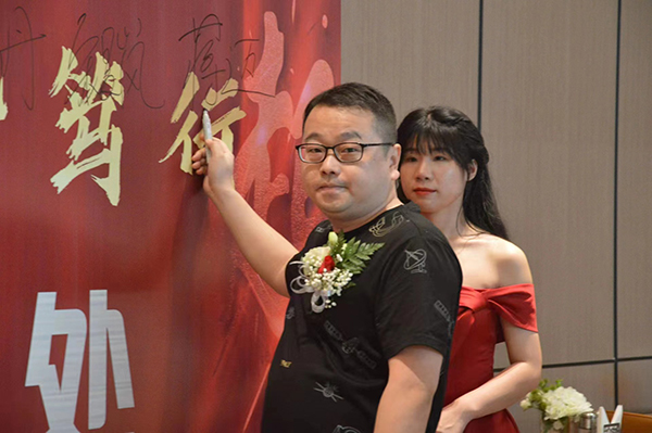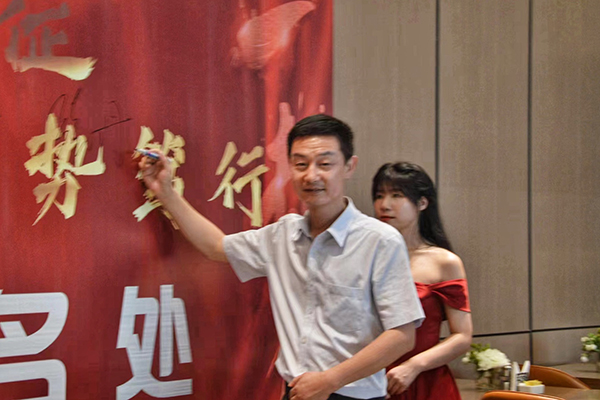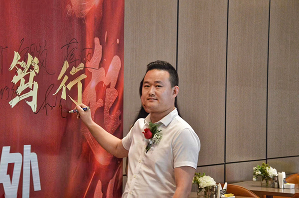 武汉分公司副总经理何亮代表全体员工郑重表态:本次乔迁新职场,标志着武汉分公司进入了新的发展阶段,武汉万乘将坚决贯彻总裁室的战略部署,在下半年实现团队过百人、佣金收入过百万的“双百”目标,向集团总裁室交一份满意的答卷!