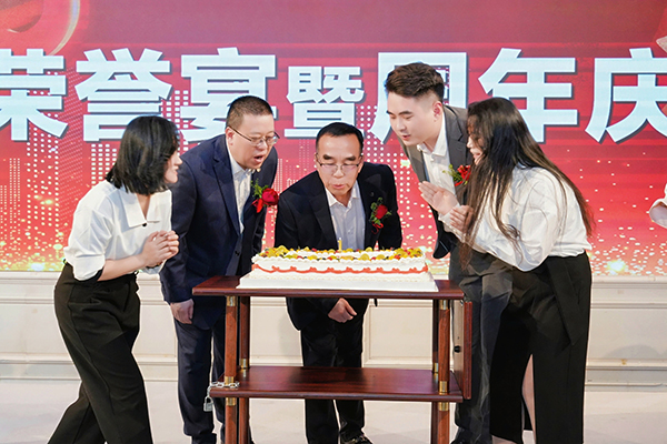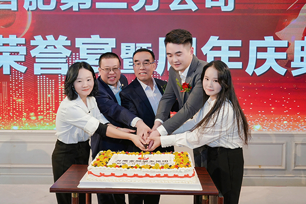8时08分,在全场合唱的生日歌中,摇曳着烛光的蛋糕车推到舞台中央。韩晓总裁、韩超副总裁、唐世豪总经理助理,以及两名优秀员工代表共同许愿,吹熄蜡烛,切开蛋糕,标志着合肥第二分公司开启了第二个生命的周期。