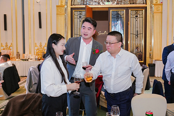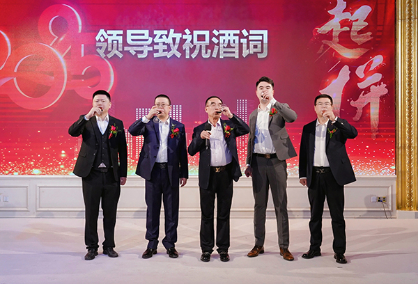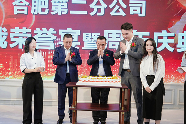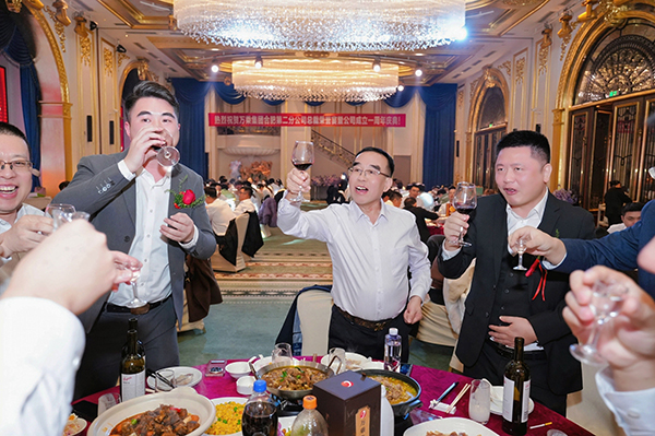 致辞结束后,韩晓总裁、杨帅副总裁、韩超副总裁、白云冰总经理、唐世豪总经理助理联袂上台,向全体员工和嘉宾敬酒。宾主共同举杯,祝合肥第二分公司一周岁生日快乐,祝合肥第二分公司业绩长虹,财源广进。