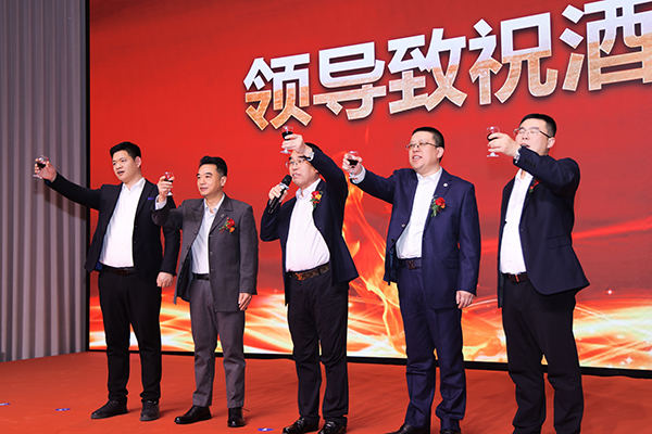 颁奖结束后,一曲热情奔放的爵士舞《黄金时代》点燃了晚会热烈的气氛。爵士舞后,主持人邀请各位领导上台敬酒。韩晓总裁、刘润东董秘、韩超副总裁、白云冰总经理、张远远总经理助理联袂上台敬酒。宾主共同举杯,祝德州分公司一周岁生日快乐,祝德州分公司业绩长虹,财源广进!
