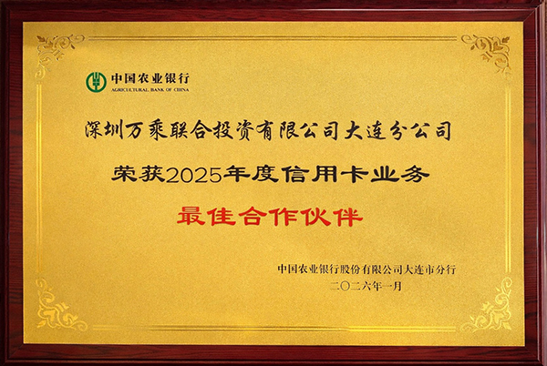 大连万乘与中国农业银行股份有限公司大连市分行合作多年,获此殊荣,充分体现了中国农业银行大连市分行对大连万乘长期以来与银行紧密合作、携手共进及服务质量的认可,也是对大连万乘农行团队业务综合实力的肯定,更是大连万乘全体农行业务团队努力拼搏的战绩,激励大连万乘农行团队追求新的高度。