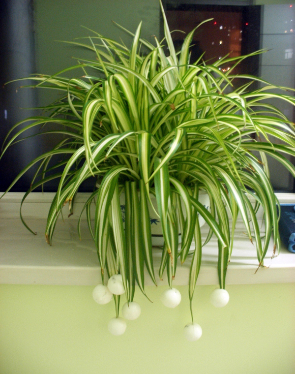 儿子脾胃不好,医生建议他吃大山楂丸,他将吃完的包药蜡模夹在吊兰的叶子下面制成了别具特色的盆景。