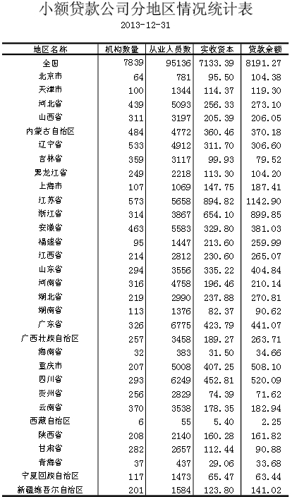 1月26日消息,央行今日公布了《2013年小额贷款公司数据统计报告》。截至2013年末,全国共有小额贷款公司7839家,贷款余额8191亿元,全年新增贷款2268亿元。