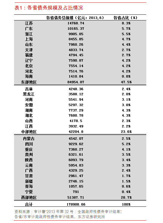 从总量上看,中国政府债务风险可控,但市场普遍担忧的是“是否会在一些局部区域出现问题”。本文将对全国30个省市(西藏没有公布数据)地方政府债务的横向对比分析,从各自债务规模及在全国中的占比、债务在不同层级(省、市、区县、乡镇)的分布结构、举债主体特征、债务类型、债务投向、偿债压力及风险等六个维度展开。