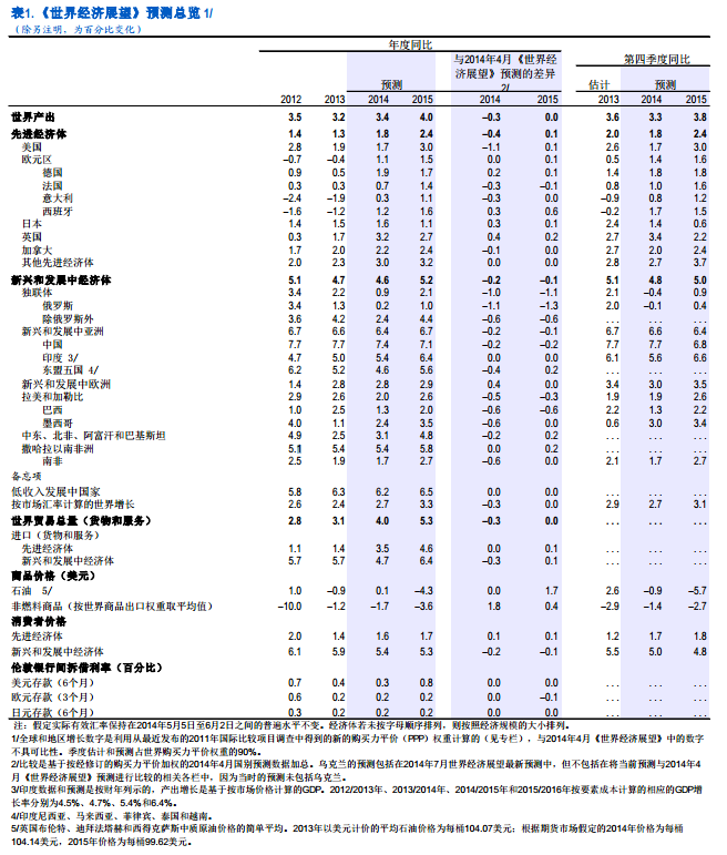 国际货币基金组织(以下简称IMF)2014年“世界经济展望最新预测”新闻发布会北京时间今晚23时召开,IMF报告指出全球经济继续经历不均衡复苏。2014年全球增长预测下调了0.3个百分点,降至3.4%,原因是第一季度增长疲软(特别是美国)产生的遗留影响,以及几个新兴市场的前景变得不那么乐观。预计一些先进经济体明年的增长将有所增强,因此,2015年增长预测仍为4%。