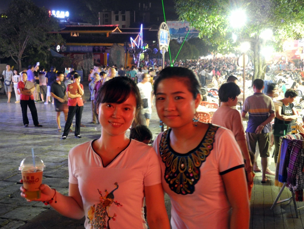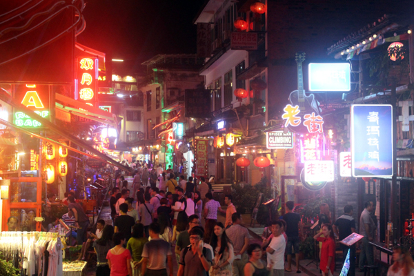 西街是一个浓缩华夏精华的中式小镇,店铺里摆挂着各种各样的中华民族传统饰物,如景泰蓝色图腾的布染、人工刺绣的荷包、挂带、不同式样的中国结和平安福。这个山水相交,聚集天地灵气的小镇,吸引着成千上万急于了解中国的外国人,这种情结像中国结一般缠绕在街道每个角落。