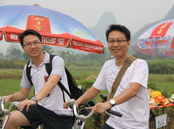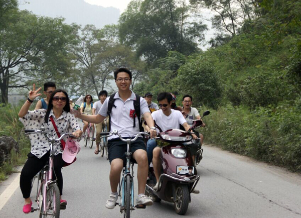 回到酒店,卸去一天旅途的疲惫,28日上午8点30分,我们踩着自行车,一起来到遇龙河漂流,感受阳朔山清水秀的自然风光。
