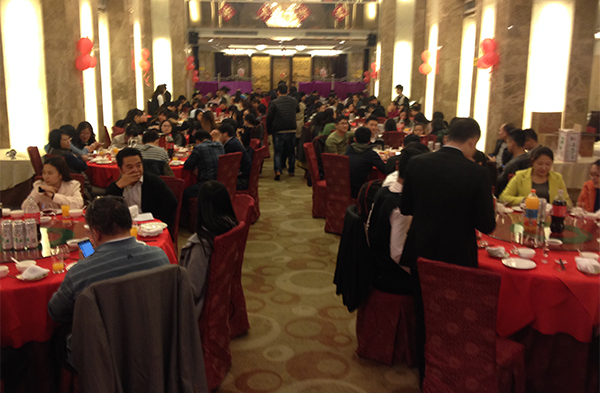 酒店宴会厅灯光明亮,人们的欢声笑语传递着祥和喜庆的节日气息。下午6时30分,团拜会正式开始,全场响起热烈的掌声。