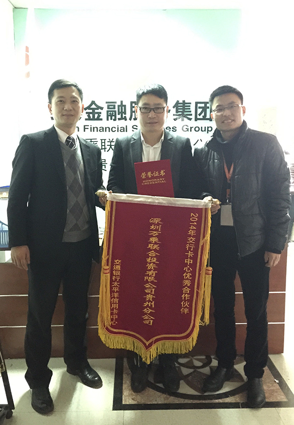 一分耕耘获得一分收获,一粒汗水带来一份快乐。在集团领导的指引下,在贵州万乘全体员工的共同努力下,我们对服务至诚奉献的精神得到了交行一致肯定和好评,2015年2月,贵州万乘荣获交通银行贵州省分行“优秀合作伙伴”锦旗。