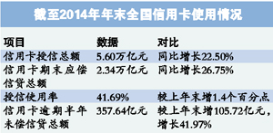 昨日,央行发布数据显示,截至2014年年末,信用卡逾期半年未偿信贷总额357.64亿元,较上年末增加105.72亿元,增长41.97%;信用卡逾期半年未偿信贷总额占期末应偿信贷总额的1.53%,占比较上年年末上升0.16个百分点。