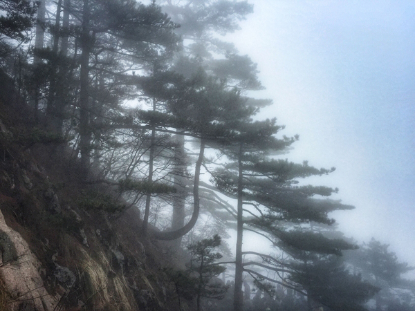 虽然已近四月,此时的黄山再次被浓雾笼罩,空气中夹杂着些许凉意,阵阵凉风袭来,使登山者神清气爽。我们在白鹅山庄用完午餐后,开始向海拔1860米的光明顶进发。