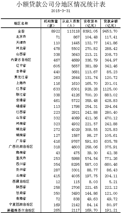 截至2015年3月末,全国共有小额贷款公司8922家,贷款余额9454亿元,一季度新增人民币(6.1970, 0.0030, 0.05%)贷款22亿元。