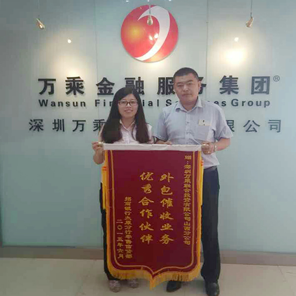 2015年6月17日,招商银行太原分行个贷中心常经理一行到访山西万乘,特意授予山西万乘“外包催收业务优秀合作伙伴”锦旗,借山西万乘喜迁新址之际,前来道贺!