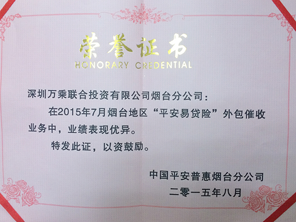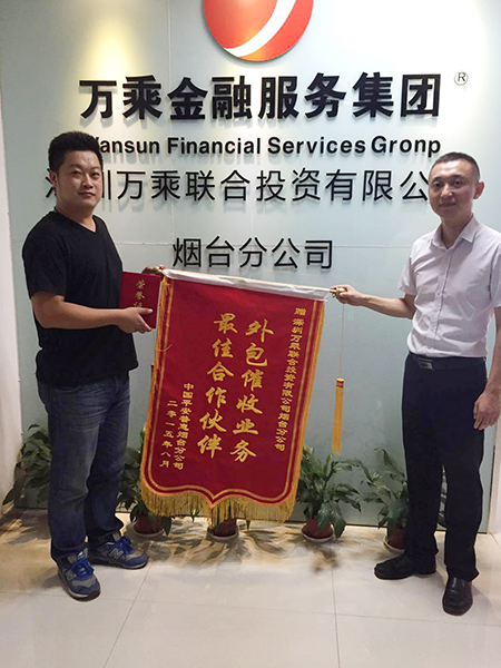 烟台万乘自今年6月以来首次与平安普惠合作,并在7月份取得优异的成绩,承揽了烟台地区7月份平安普惠80%以上的回收业绩,得到平安普惠烟台分公司全体员工的好评和认可。