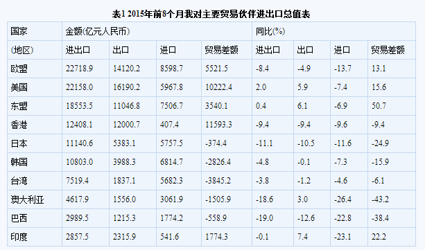 二、对美国、东盟出口保持增长,对欧盟、日本出口下降。前8个月,欧盟为我国第一大贸易伙伴,中欧贸易总值2.27万亿元,下降8.4%,占我外贸总值的14.5%。其中,我对欧盟出口1.41万亿元,下降4.9%;自欧盟进口8598.7亿元,下降13.7%;对欧贸易顺差5521.5亿元,扩大13.1%。美国为我国第二大贸易伙伴,中美贸易总值为2.22万亿元,增长2%,占我外贸总值的14.1%。其中,我对美国出口1.62万亿元,增长5.9%;自美国进口5967.8亿元,下降7.4%;对美贸易顺差1.02万亿元,扩大15.6%。
