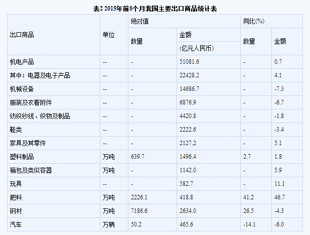 五、机电产品出口增长,传统劳动密集型产品有所下降。前8个月,我国机电产品出口5.11万亿元,增长0.7%,占出口总值的57%。其中,电器及电子产品出口2.24万亿元,增长4.1%;机械设备1.47万亿元,下降7.3%。同期,服装出口6876.9亿元,下降6.7%;纺织品4420.8亿元,下降1.8%;鞋类2222.6亿元,下降3.4%;家具2127.2亿元,增长5.1%;塑料制品1496.4亿元,增长1.8%;箱包1142亿元,增长5.9%;玩具582.7亿元,增长11.1%;上述7大类劳动密集型产品合计出口1.89万亿元,下降2.1%,占出口总值的21.1%。此外,肥料出口2226.1万吨,增加41.2%;钢材7186.6万吨,增加26.5%;汽车50.2万辆,减少14.1%(表2)。